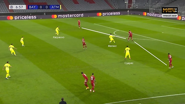 У Баварии есть одно большое преимущество - у них и справа в обороне, и слева играют защитники, которые являются и центральными, а это значит, что в начальной фазе построения атаки могут опуститься в центр и правый защитник, и левый. В начале атак Баварии линию защиты составляют 3 человека - Павар, Зюле и Алаба, их прессингуют Феликс, Суарес и Карраско.