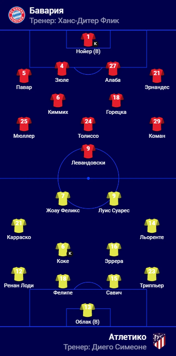 Наконец-то у Баварии полностью готовый стартовый состав, Павар и Эрнандес покупались в стартовом составе, но вместе почти не играли, и вот сегодня оба в старте. В опорной зоне Киммих и Горецка, эта связка работает шикарно, одна из лучших в Европе. Ну и в атаке Мюллер справа, Коман слева, Толиссо в центр, и над ними Левандовски. Мюллер не будет играть флангового атакующего, он будет смещаться в центр, а на фланге будет Коман в зависимости от того, где ему сейчас удобно, и тот фланг, на котором не будет играть Кингсли будет страдать, будет отрабатывать за двоих, это будет либо Павар, либо Эрнандес.