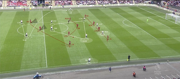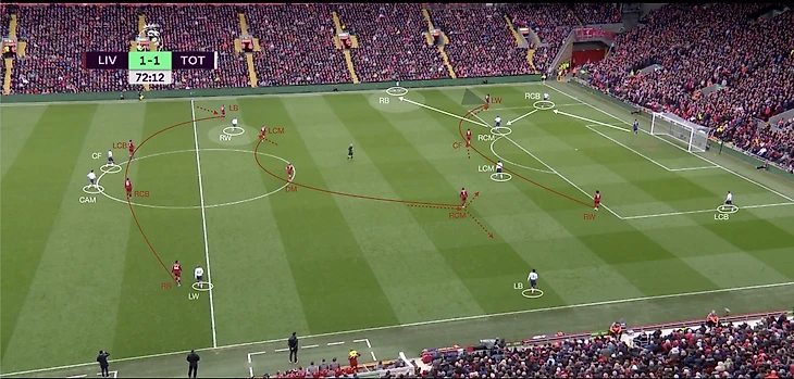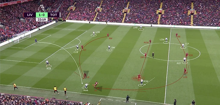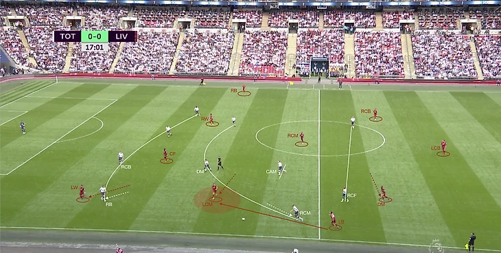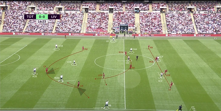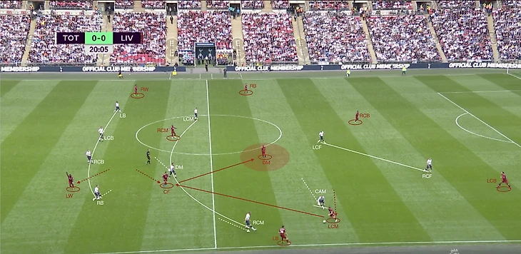 Фирмино опускается в центр поля, сковывая действия опорного полузащитника «шпор». Левый защитник выманивает на себя правого центрального полузащитника «Тоттенхема» в то время как опорник «Ливерпуля» остается совершенно свободным. После комбинации между полузащитником и Фирмино именно он и получит мяч, имея достаточно времени и пространства, чтобы принять решение и продолжить атаку.