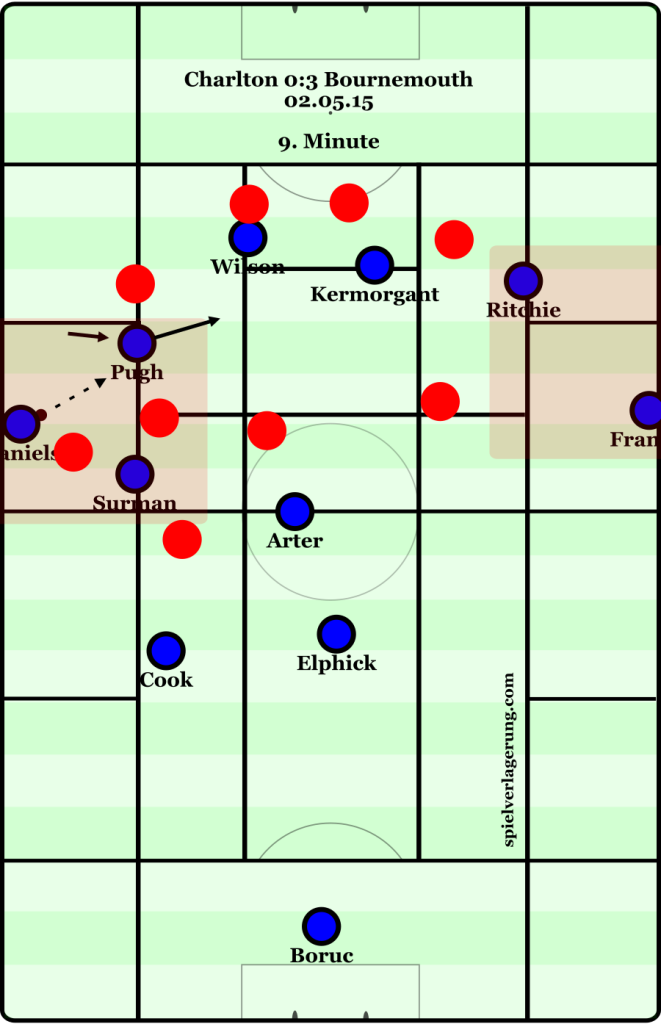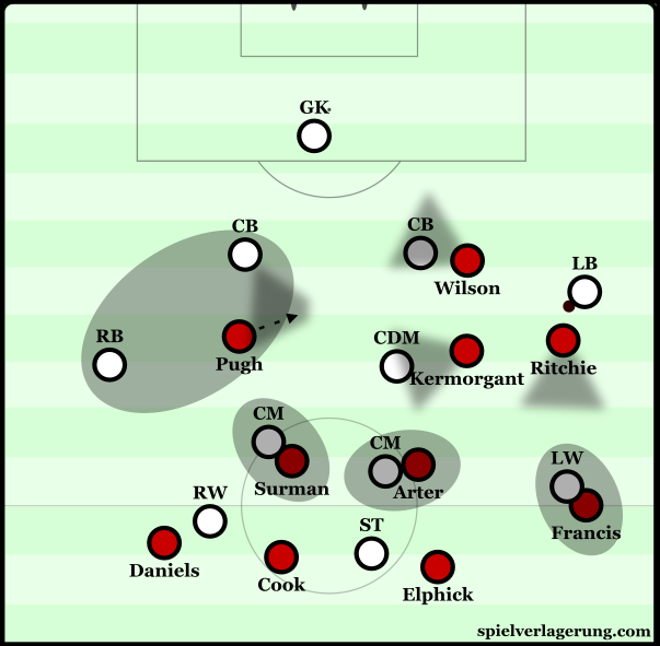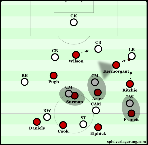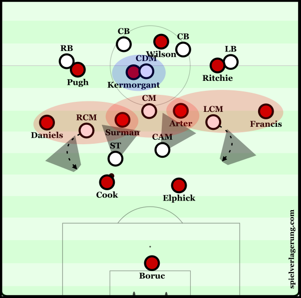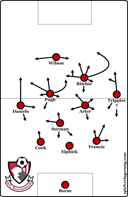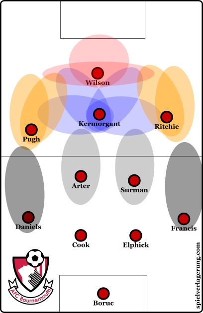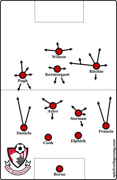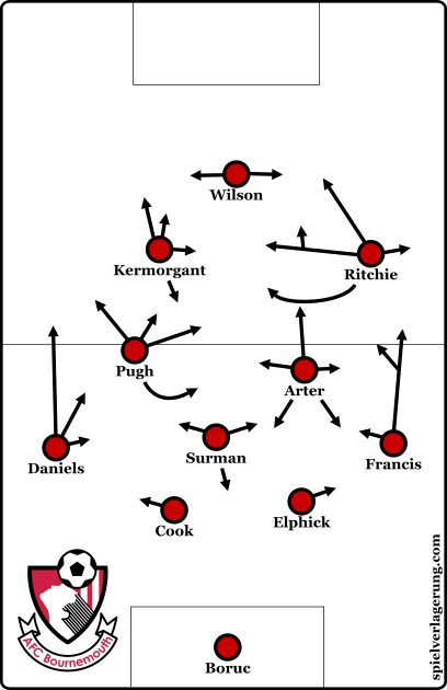 В центре поля Борнмут обладал двумя лучшими полузащитниками Чемпионшипа, которые крайне важны были в матчах. Артер и Сюрмен доставляли мяч из защиты в атаку. Зачастую они все же остаются за мячом и обеспечивают циркуляцию в центре поля. На флангах Мэтт Ричи и Марк Пью имеют разные задачи. Первый чаще смещался к нападению и играл в роли инсайда, когда второй больше работал на полузащиту и давал простор Дэниелсу.