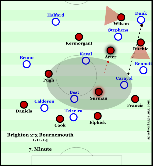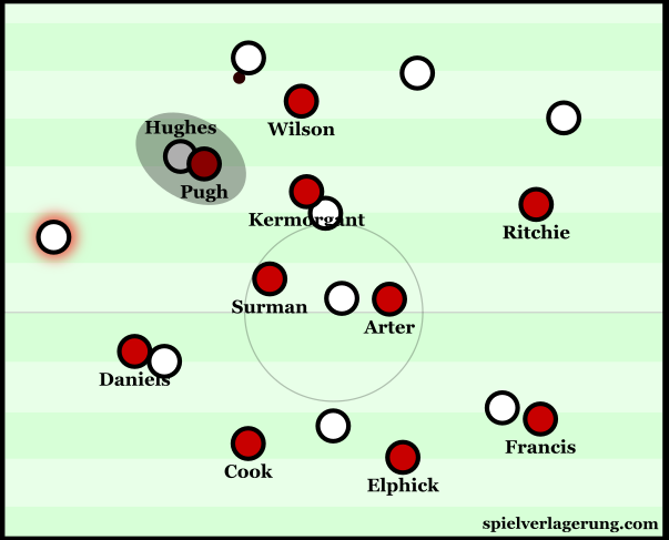 Одним из недостатков длительного владения мячом Борнмутом является центр защиты, в котором размещены Кук и Элфик. Оба технически одаренные, но при прессинге со стороны соперника дают слабинку. Если отсутствует поддержка от полузащитников, то может возникнуть проблема, которой воспользуется оппонент. Соперник старается изолировать защитников от полузащиты, чтобы оказаться в ситуации 1 на 1 с ними. В такой игре очень важна роль опорного полузащитника, которым выступал Кермогант. Француз имел связь с защитой и позволял играть в прямой футбол, противостоя системе прессинга.