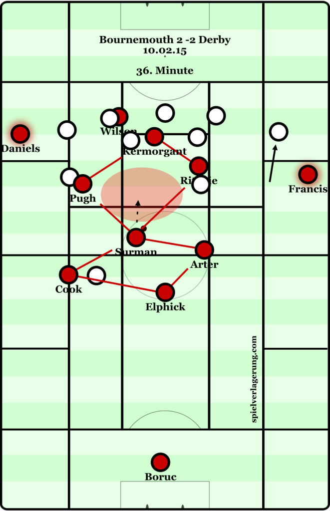 Когда мяч попадает в центр поля, Борнмут ищет способы для господства на этом участке. Ричи и Пью поглощаются центром, тем самым давая пройти фланговым защитникам. В первом ромбе получилась ситуация 4 в 1. Сюрмен имеет различные варианты развития атаки, условно двигая второй ромб к воротам соперника. Имея свободу, можно пользоваться некомпактными секторами Дерби. Латерали растягивают оборону соперника, чтобы Кермогант мог более спокойно передвигаться в центре, а Пью и Ричи развивали потенциальную атаку.