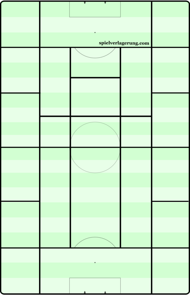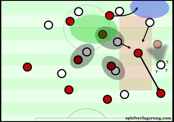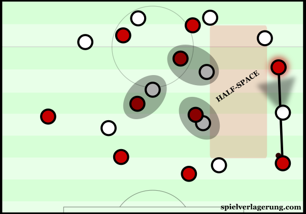 Здесь полупространство не используется, полузащитник соперника прижимает к бровке вингера и латераля, а в свободной зоне идет персональная опека. Там поддержки для атаки мало.