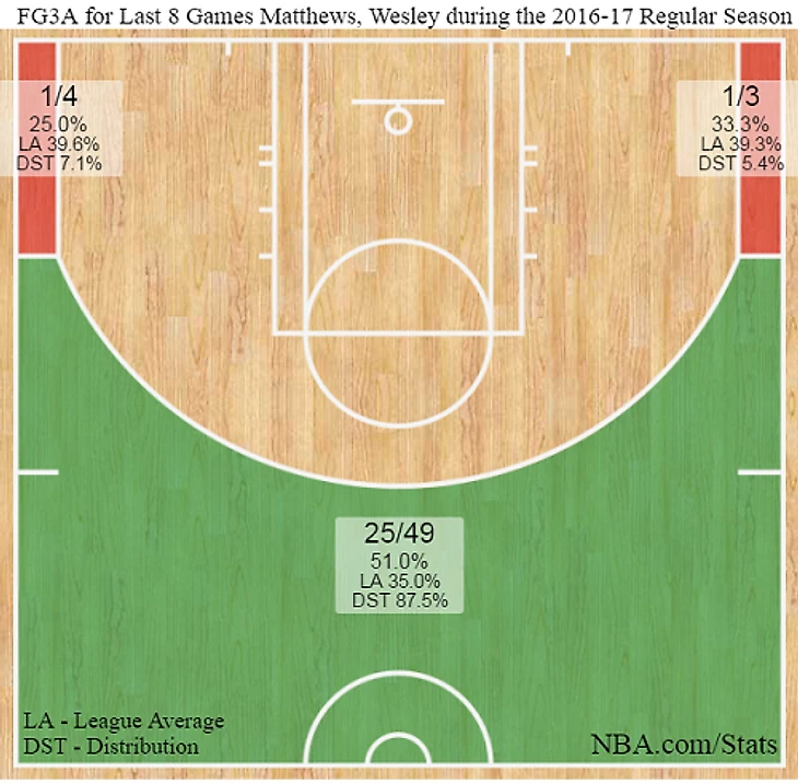 Совмещая ни много ни мало роль первой опции в нападении "Маверикс" вместе с Харрисоном Барнсом, в первых семи матчах чемпионата Мэттьюз отметился ужасающей статистикой - 28.9% с игры и 24.1% с "кормящей" трехочковой линии. Разумеется, никто не ожидал, что от увеличения количества бросков эффективность ролевого защитника останется на прежнем уровне, но проблема заключалась далеко не только в этом. Вместе с промахами в условиях цейтнота Уэсли мазал и огромное количество открытых бросков, что ему никогда не было свойственно. Важность успешной игры Мэттьюза на периметре для нынешних "бродяг" переоценить крайне сложно. За всю историю франшизы чаще него из-за дуги атаковал только один игрок - Джордж Маклауд (8,6 броска в среднем) в бородатом сезоне 1995-96, когда НБА укоротила 3-очковую линию на несколько футов с целью стимулировать команды на увеличение количества дальних попыток.