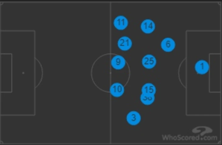 Также не нужно забывать его переводы с фланга на фланг при позиционных атаках на чужой половине Лестера, да это было очень редко, но было. Нужно отметить что по усредненных позициях у Лестера нету ни одного игрока на чужой половине. Подтверждением что это был как минимум мини-автобус есть данные по всем действиям на каждой трети поля - на оборонительной трети Сити игра шла всего 14% времени (Если взять все время 100% времени = 90 минут, то это всего лишь 12,6 минут.