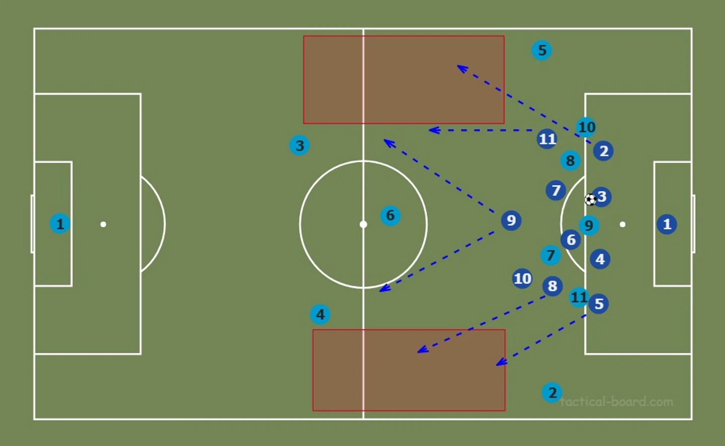 На протяжении матча подопечные Гвардиолы прессинговали достаточно высоко и большим количеством игроков, поэтому Лестер очень просто отрезал группу игроков Сити передачами во фланги. Это было преимущественно в зоны, который показаны на рисунке. Туда сразу выбегали несколько игроков лис, и они старались продолжать контратаку.