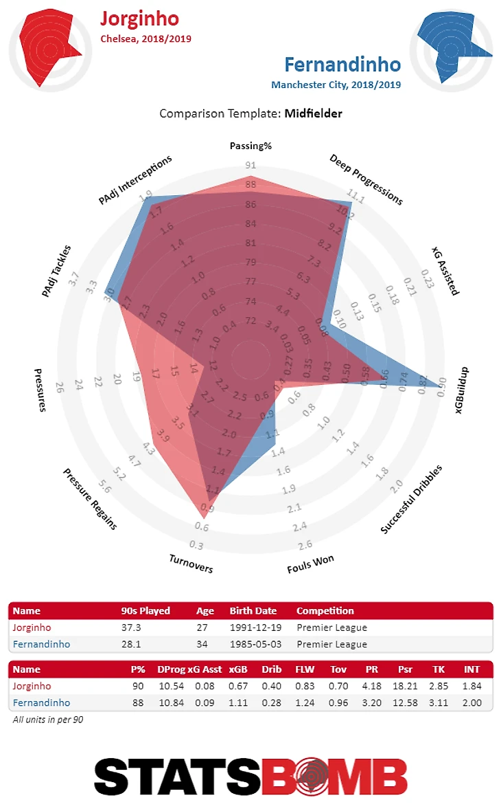 Класс Жоржиньо был понятен и год назад: он элитный игрок. Даже в часто недееспособном «Челси» он показал точность передач 89% и делал 10,54 deep progressions/90. Его пасы никогда не вызывали вопросов. В обороне вклад бразильского итальянца неплохой и для системы Гвардиолы этого было бы достаточно (3,8 отборов + перехватов/90). 1,07 xG buildup/90 Фернандиньо рассказывает нам больше о "Манчестер Сити", чем о игроке.