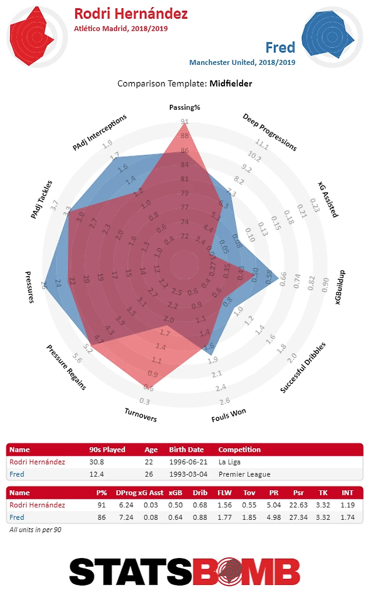 Фред мало чем отличается от Родри, замены Фернандиньо этим летом. Оба игрока в прошлом сезоне выдали 3,32 отбора с поправкой на владение мячом за 90 минут. Молодой испанец с его точностью передач 91%. Но он также редко продвигал мяч вперед. Родри выполнил 6,24 deep progressions/90 - примерно половину от показателя Фернандиньо в сезоне 2017/18 - и был ниже уровня среднего полузащитника Ла Лиги для успешных дриблингов и xA. Вероятно, это частично связано с ролью специфической тактики "Атлетико", где творческая работа полузащиты ограничена. В Мадриде Родри был ведущим игроком команды и четвертым по продвижению мяча.