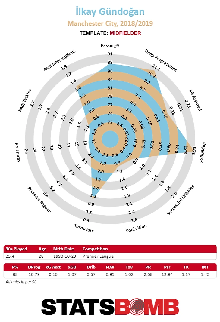 Не сумев подписать Жоржиньо, в "Сити" сделали ставку на Гюндогана. Немец справился неплохо, но это не уровень основы. В созидании дела достаточно хорошо, но в обороне у него были проблемы. Илкай покрывал немного пространства. Некоторые различия, вероятно, связаны с тем, что Гюндоган также использовался в различных ролях выше по полю, где у него было меньше защитных обязанностей. Такое использование помогает объяснить, почему данные Жоржиньо больше похожи на профиль Фернандиньо, чем данные Гюндогана.