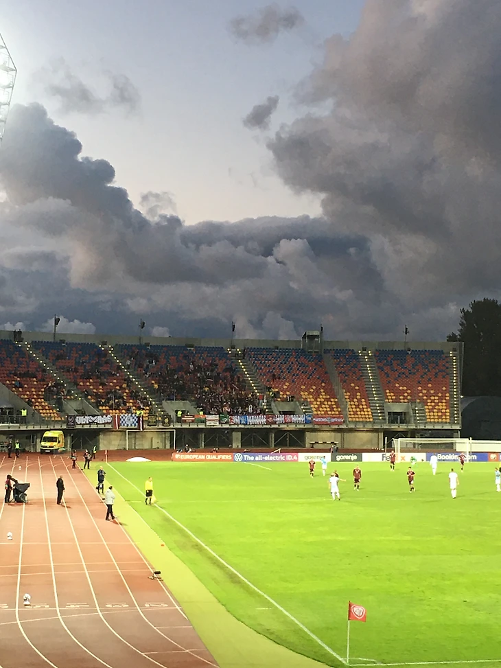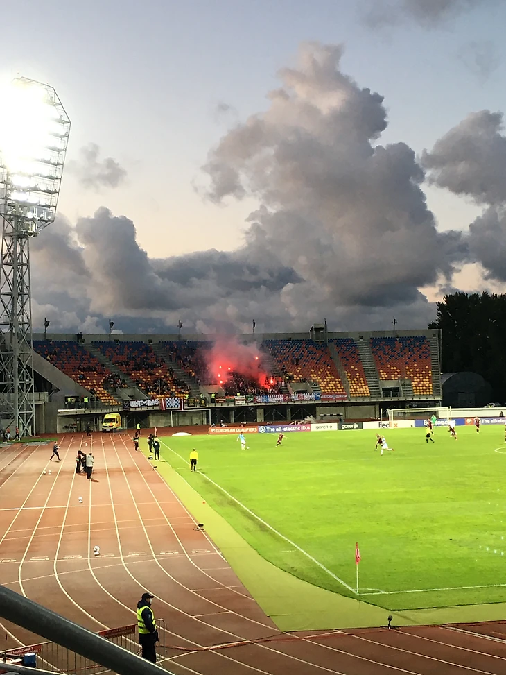 На 62-ой минуте матча на фанатском секторе сборной Латвии были видны красные огоньки. Фанаты зажгли несколько «файеров». Незадолго после этого, на 64-ой минуте, особо внимательные болельщики могли заметить, что также включилась подсветка между рядами на трибунах.