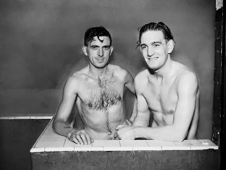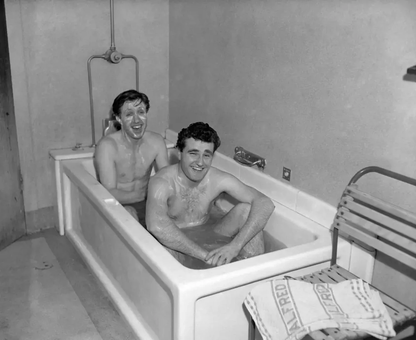 Защитники «Вест Хэма» Джон Бонд (слева) и Ноэл Кантвелл принимают ванну перед игрой Кубка Англии с «Блэкберном» в 1956 году.