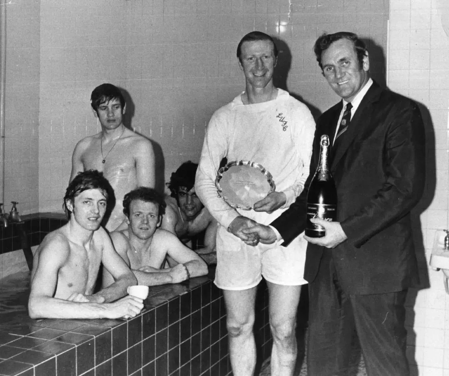 Джек Чарльтон получал награду «Футболист месяца» возле ванны в раздевалке.