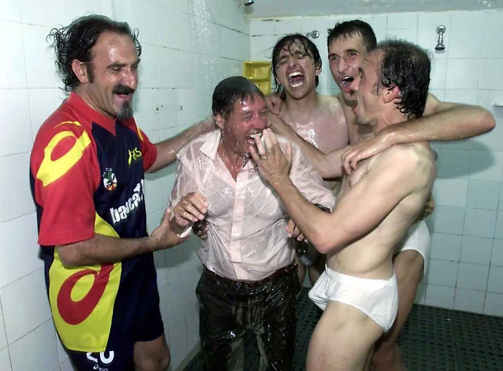 После 90-х такое в футболе почти не встречается. Но вот вам бонус: игроки «Лечче» празднуют победу над «Лацио» (2:1) в последнем туре Серии А-2000/01. Команда спаслась от вылета.