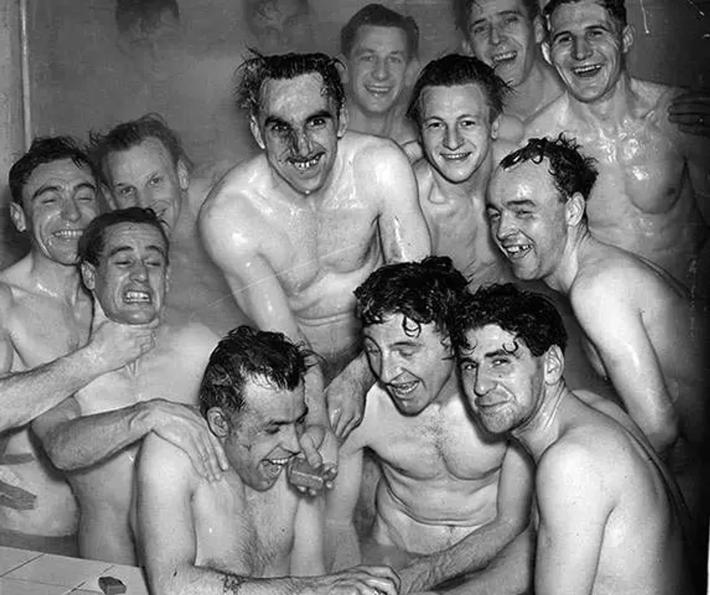 И в 1950-м. Готовятся к матчу Кубка Англии против «Челси». Мыло выглядит очень опасно.