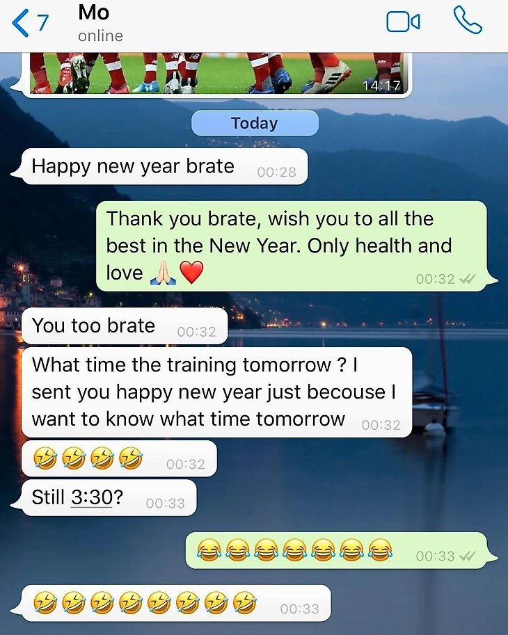 «И тебе, брат. Во сколько завтра тренировка? Поздравил тебя с Новым годом только потому, что хочу узнать, во сколько завтра тренировка. В 15:30?» – пошутил египтянин.