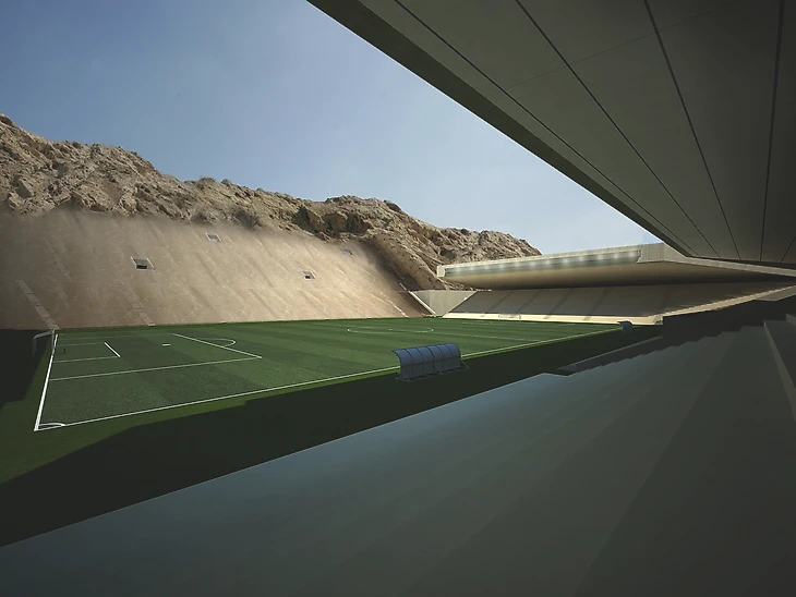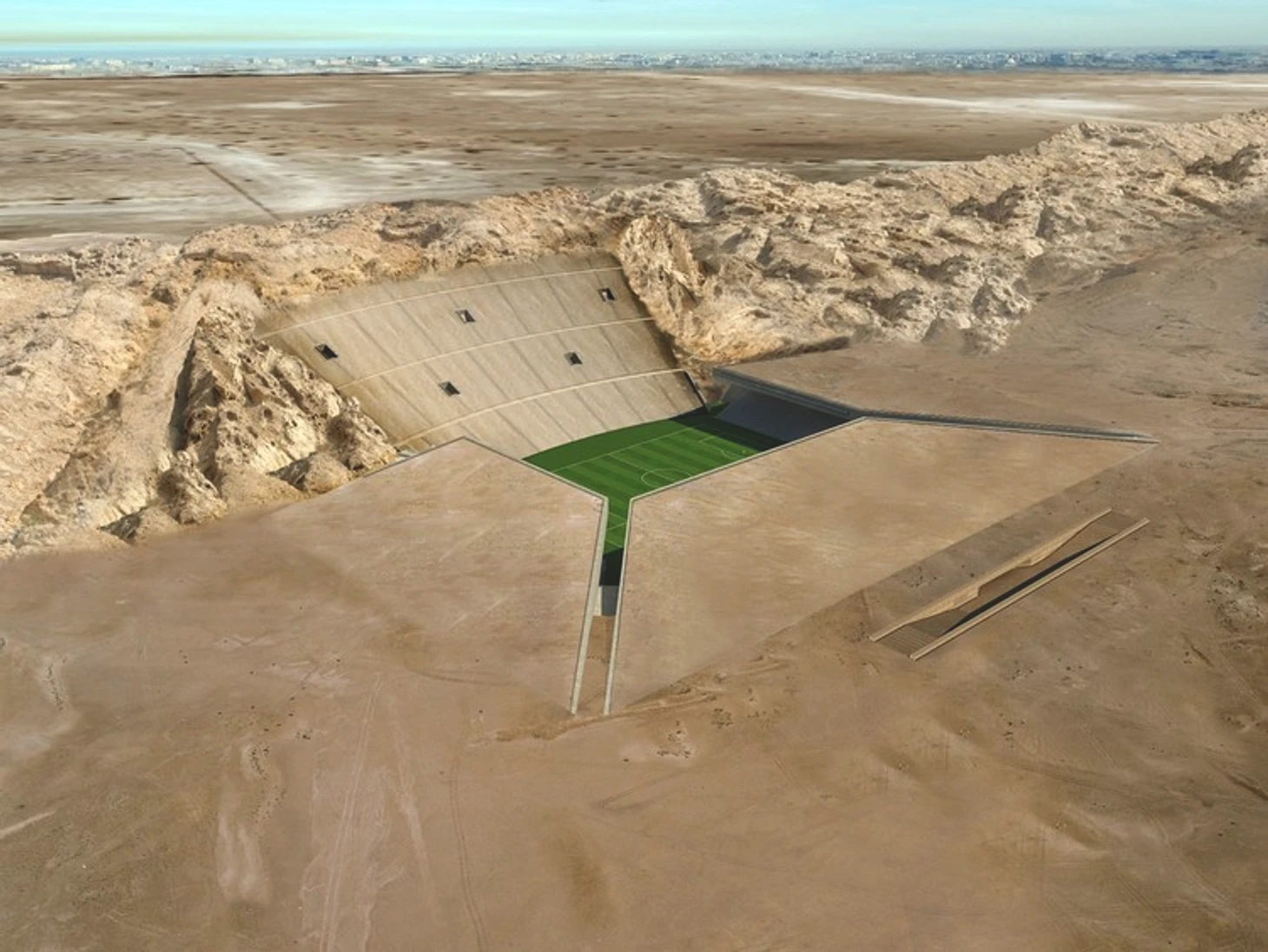Проект футбольного стадиона в скале – что-то вроде стилизации под иорданскую Петру – появился почти десять лет назад. Его хотели построить в пустыне рядом с Абу-Даби, даже выбрали место, но что-то пошло не так.