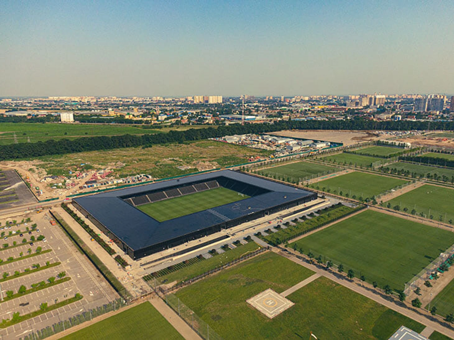 Стадион построила турецкая компания Esta Construction, а автор проекта — архитектурное бюро GMP, которое занималось основной ареной «Краснодара» и прилегающим к ней парком.