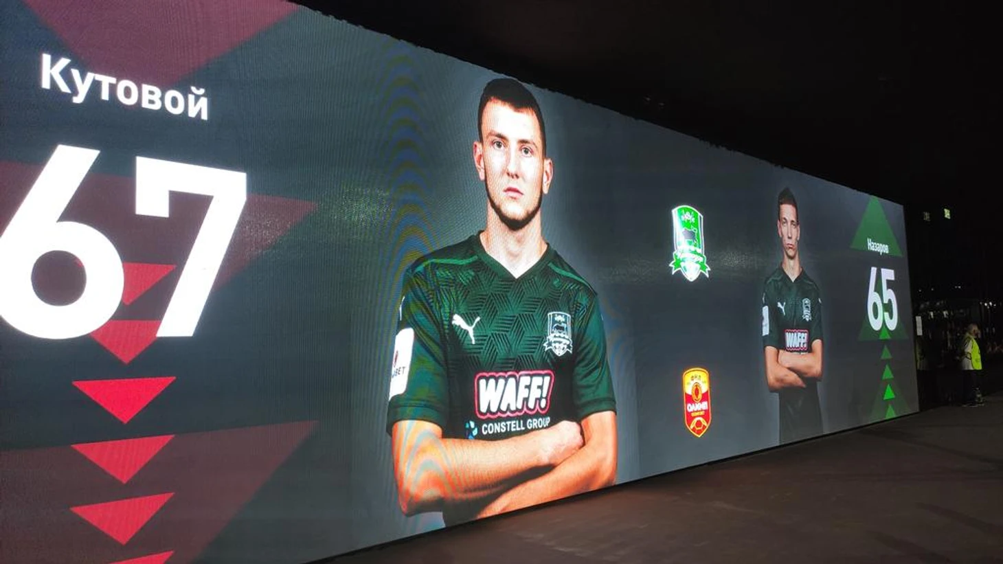 На арене два медиаэкрана – на боковых трибунах. Показывают не только голы. но и замены с изображениями футболистов.