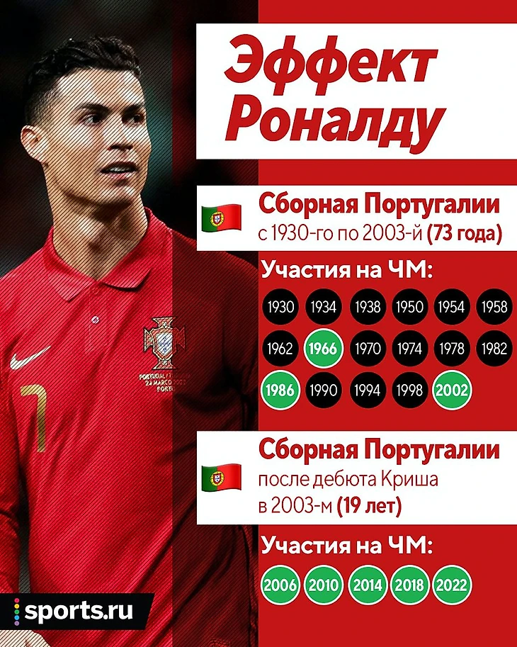 Катар будет 5-м чемпионатом мира для Криштиану. Кстати, для Лионеля Месси тоже – две главные звезды современности играют на ЧМ с 2006 года.
