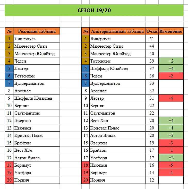 И вот сегодня, когда сезон уже закончен, все выводы сделаны, я представляю вашему вниманию пересчитанную турнирную таблицу за сезон 19/20.