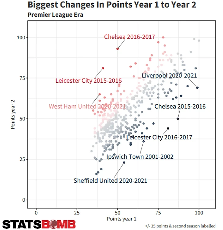 Прогресс «Вест Хэма» видно из данной таблицы. В сравнении с сезоном 2019/20 +26 очков. Это третий результат в истории Премьер-Лиги. Большего скачка удавалось добиться лишь чемпионам: «Лестеру» - 2016 и «Челси» - 2017.