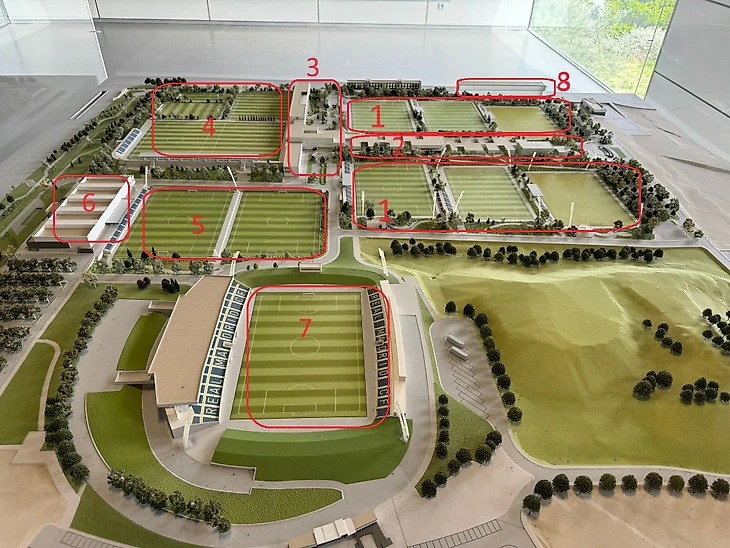Если посмотрите на карту на фото, то, во-первых, красным на нем обозначено место, где мы находились. Рядом есть вытянутое здание причудливой формы, это - спортивный дом кантеры. Живут они справа в углу по карте. Родители имеют доступ в эту часть только в кафетерий с террасой, откуда видны поля. Дальше - ни-ни. Причем центральных вход закрыт для команд соперников, они обходят здание по улице и заходят уже непосредственно в раздевалки.