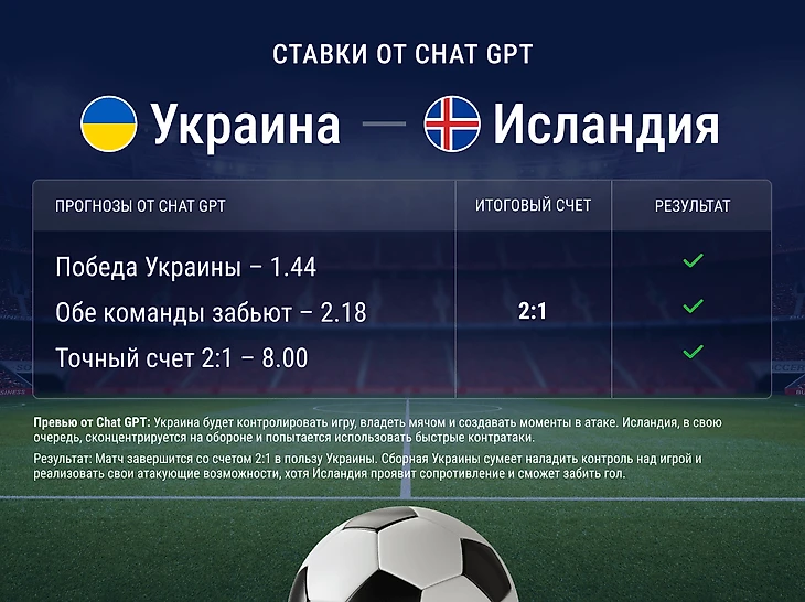 Но Украина не могла позволить себе так просто отдать встречу. Желто-синие не пропустили ни один из трех последних чемпионатов Европы и были твердо намерены забрать и путевку в Германию. Так что во 2-м тайме сначала сравнял Цыганков, а ближе к концу схватки Мудрик вывел свой коллектив вперед. Гениальный Chat GPT попал в яблочко с победителем матча, а также предугадал точный счет – 2:1.