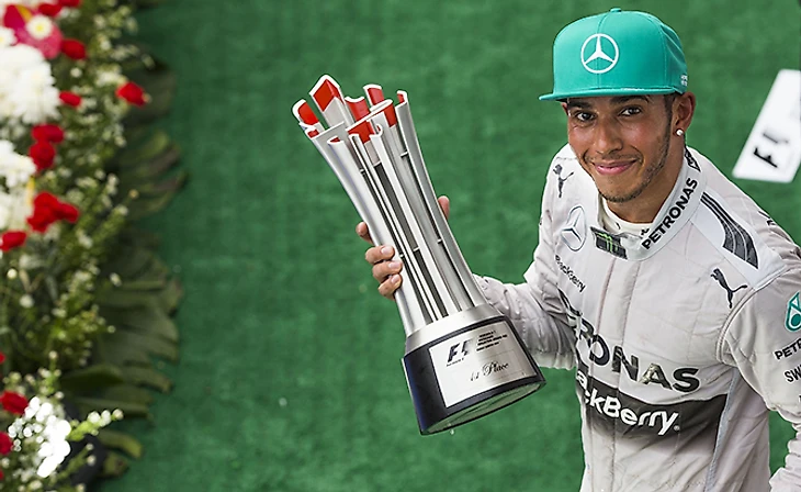 Льюис на подиуме Гран-при Малайзии. Фото: Fotobank/Getty Images Sport/Peter J Fox