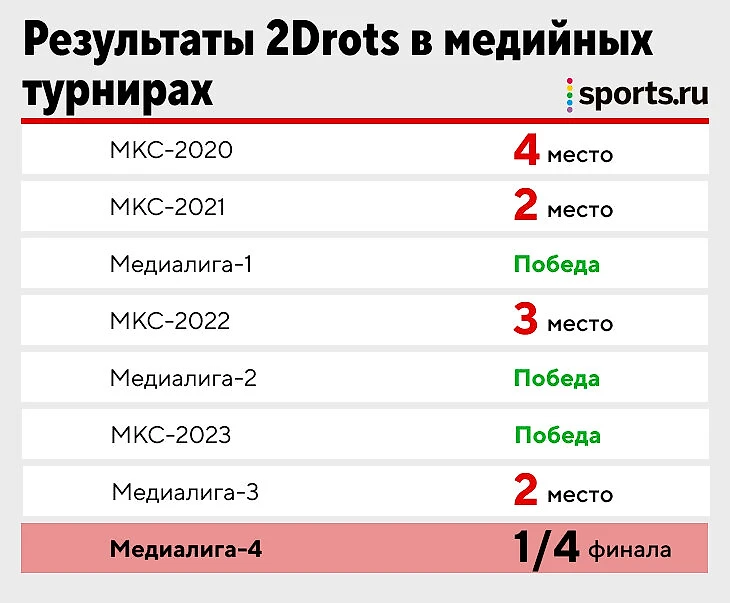 2Drots всегда были минимум в полуфинале большого медийного турнира: худшим до этого дня оставалось четвертое место на Московском кубке селебрити. В Медиалиге этой встречи с «Эгриси» – три финала и две победы в них.