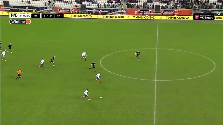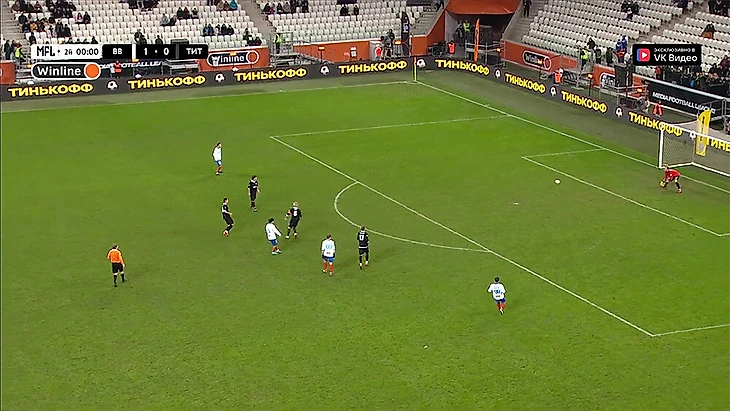 Мяч так и не побывал в ауте, значит игру можно продолжать. «Титан» аккуратно начинает атаку и даже зарабатывает угловой. Это по-прежнему не аут, поэтому игра продолжается.