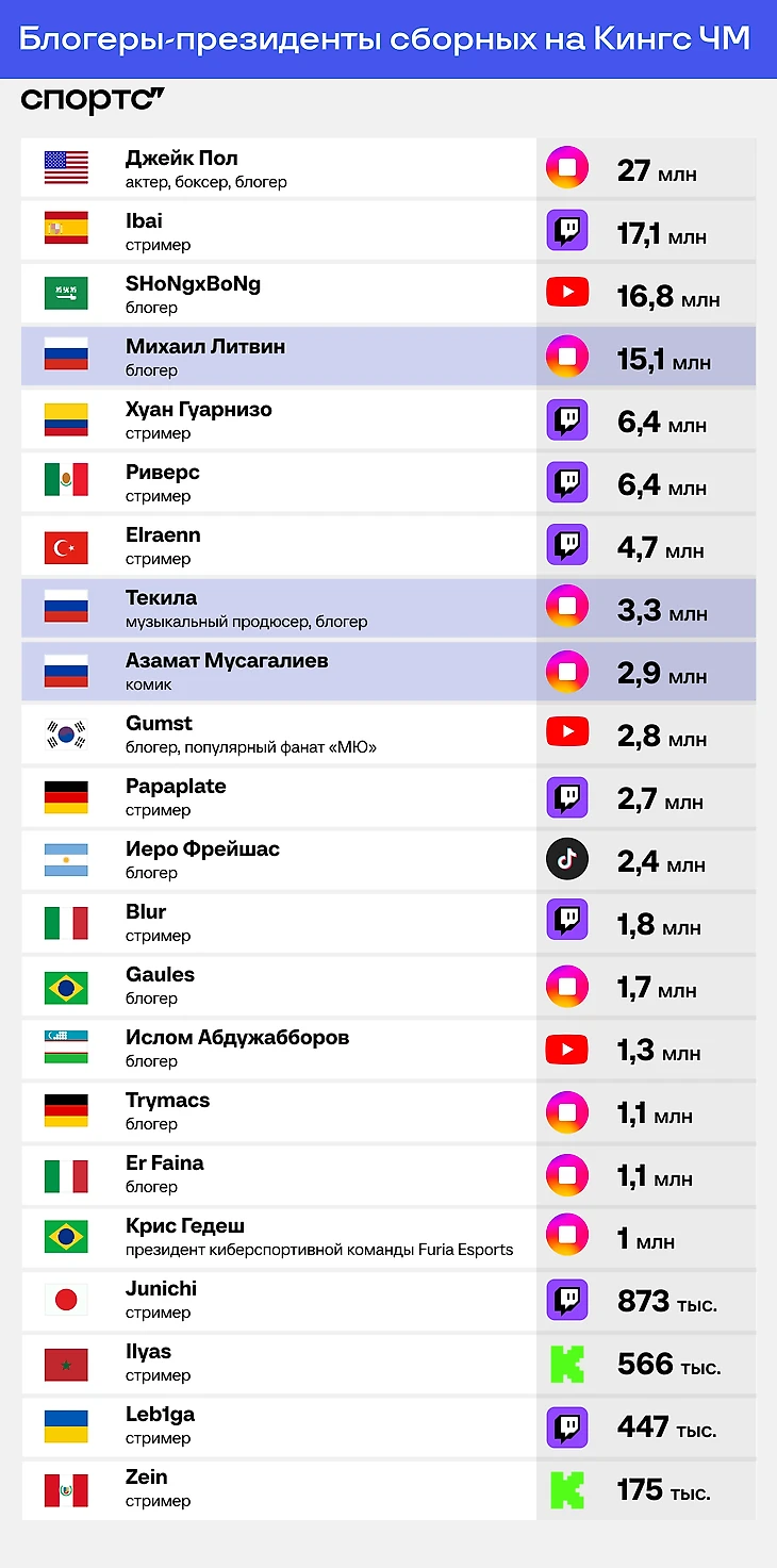 ● Россия могла бы привлечь и блогера-звезду в качестве президента. Такие есть почти у всех сборных Кингс ЧМ. Самый крупный – боксер и актер Джейк Пол из сборной США (27 млн в инстаграме). В топ-3 самых популярных боссов испанский стример Ibai (17,1 млн на твиче) и блогер SHoNgxBoNg из Саудовской Аравии (16,8 млн на ютубе).