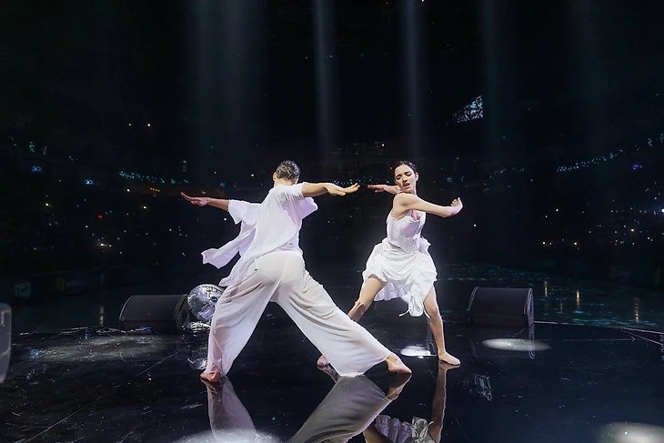 В конце вечера зрителей ждал мега-сюрприз. Женя сняла коньки и вышла на сцену со своим партнером по проекту «Звездные танцы» Ильдаром Гайнутдиновым. Под звуки песни Voilà Женя с Ильдаром показали что-то невероятное – нежность, страсть, покорение и непокорность, свободу, любовь. Зал, буквально, не дышал до самых последних нот и движений.