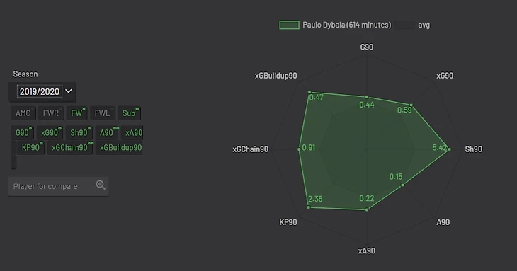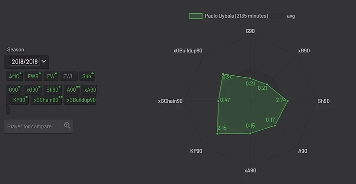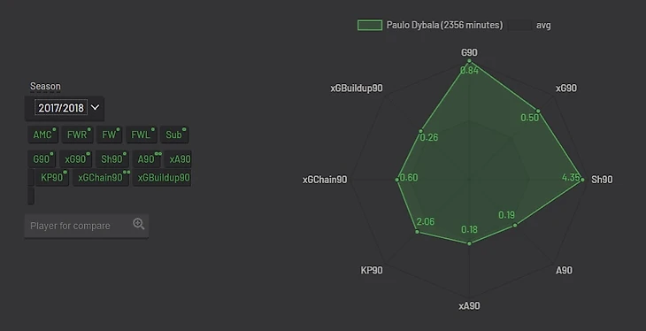 Вы можете видеть статистику Дибалы до прихода Роналду – бросается в глаза количество ударов и голов. Пауло вносил серьезный вклад в Роббеновском стиле: смещался справа, бил издали или врывался в штрафную, либо вообще играл изначально на острие, второго нападающего.