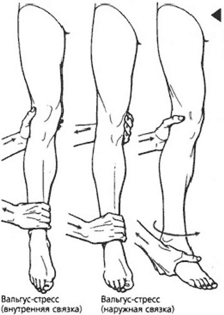 Если приложить силу под таким углом, то нога в коленном суставе будет сгибаться совсем чуть-чуть, буквально на пару градусов (важно проводить его и на здоровой ноге для сравнения, так как нормы индивидуальны). Повреждение коллатеральной связки провоцирует нестабильность и увеличение угла отклонения голени, зачастую сочетаясь с резкой болью.
