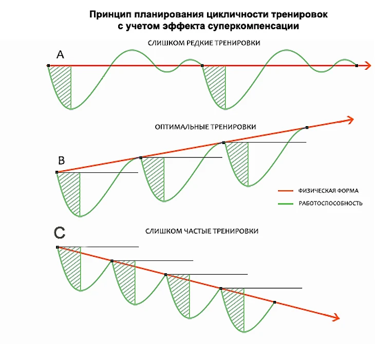 А теперь по-русски: после восстановления активируются незадействованные резервы, в сочетании с компенсаторными механизмами (рост мышечной массы, оптимизация кровотока и так далее) – они и дают эффект суперкомпенсации. Именно в эту фазу должна попасть следующая тренировка или матч. Это не один конкретный день сразу после отдыха, речь о небольшом отрезке в течение нескольких дней после.