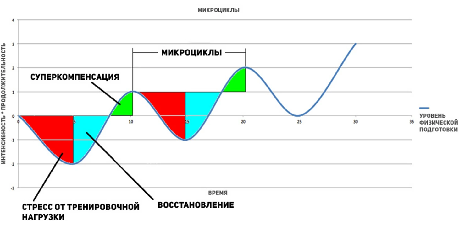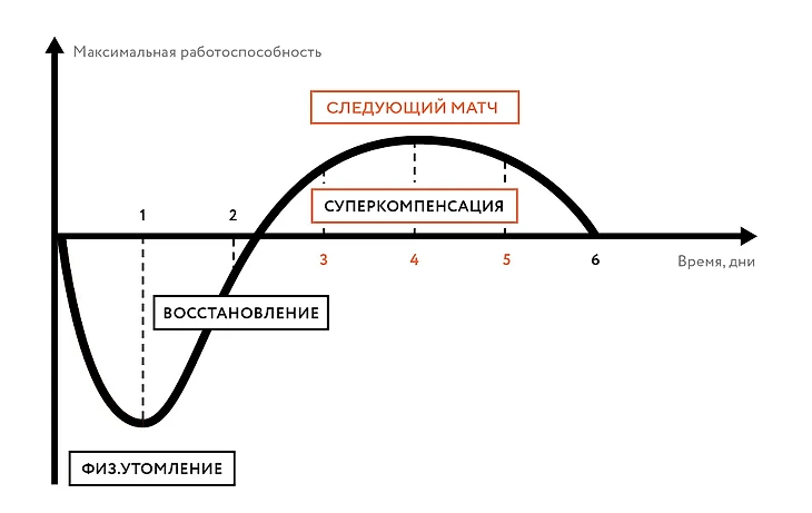 Все эти циклы нужны из-за принципа суперкомпенсации. Его суть в следующем: есть матч, за которым должно следовать восстановление, а его длительность зависит от интенсивности нагрузки. Чем тяжелее нагрузка – тем дольше должен быть отдых. Где-то хватит и хорошего сна, где-то нужен выходной, где-то два. Если восстановление прошло в полной мере, а нагрузка на тренировке/матче была адекватной, возникает эффект суперкомпенсации – то есть аккумуляции ответа организма, после кратковременного устранения нагрузки.