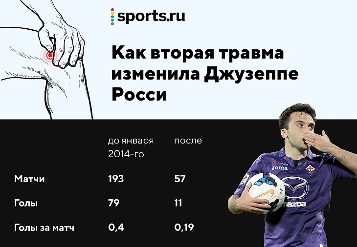 К январю 2014-го Джузеппе стал суперзвездой уже в Серии А — 16 голов в 17 матчах (среди них – хет-трик «Ювентусу»), восхищения Винченцо Монтеллы (тренер «Фиорентины» назвал Росси «истинным гением») и интерес «Баварии» и «Барсы». Сказка закончилась в январском матче против «Ливорно»: защитник Рикардо Ринаудо пошел в жесткий стык и Росси снова порвал кресты. На том же колене.