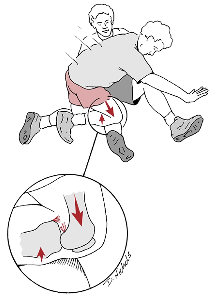 2. Неконтактные: падение, резкая смена направления, торможение, неудачные приземления.Это около 70% травм крестообразных связок. При фиксированной голени происходит вращение бедра внутрь, либо же голень и стопа при этом подворачиваются и вращаются наружу.