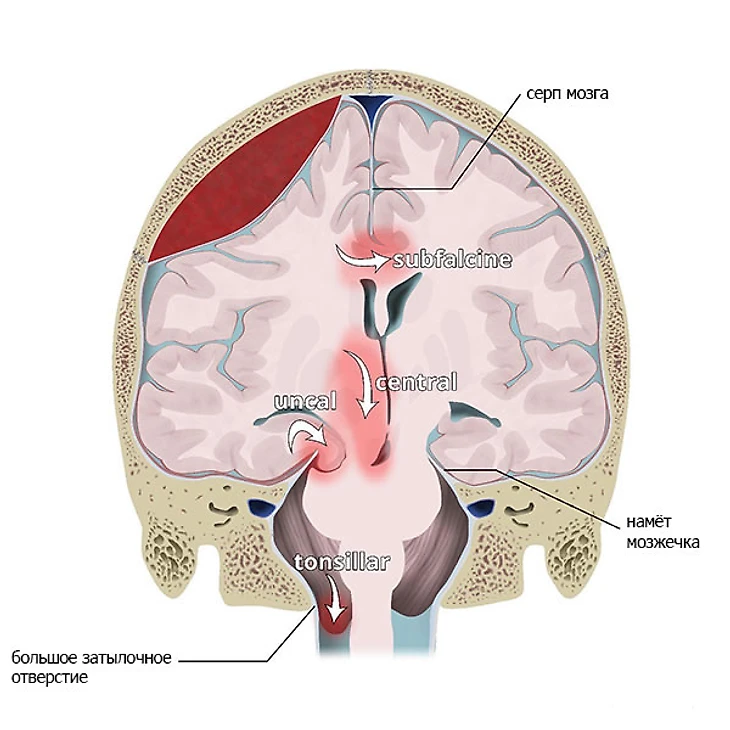 Итак, аневризма разорвалась, в пространство между оболочками мозга вылилось какое-то количество крови. Но места в черепе не так уж и много. В результате обширного кровоизлияния (а как мы помним, сосуды там большие, значит и кровопотеря соответствующая) структуры мозга могут смещаться, они сдавливают ствол мозга в области большого черепного отверстия, затрудняется отток спинномозговой жидкости, что еще больше усугубляет и без того возросшее давление. Как итог – нарушается работа жизненно важных центров, находящихся в этой области (дыхания, глотания, сердцебиения и другие), вплоть до летального исхода.