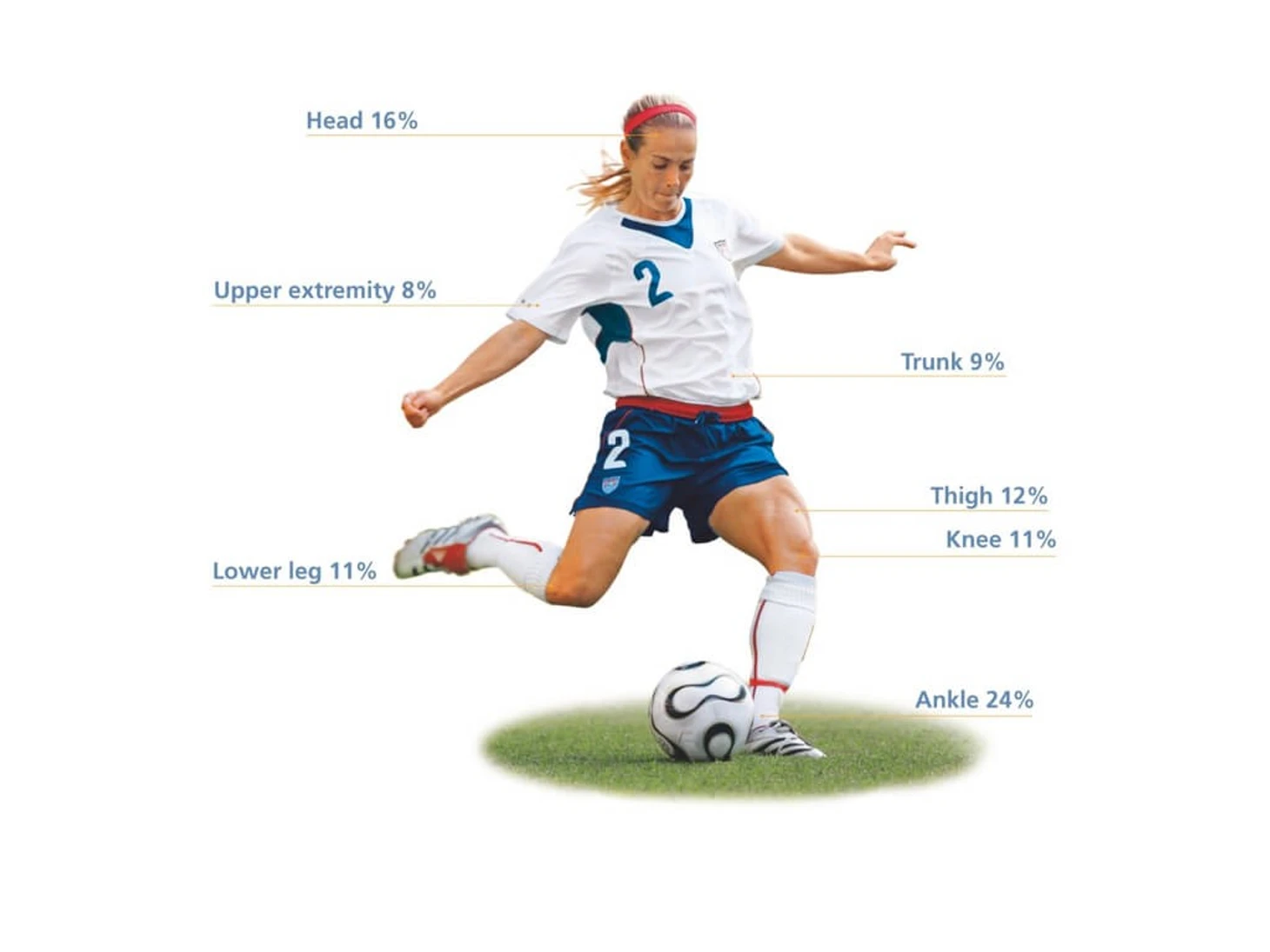• Травмы связок лодыжки – наиболее распространенное повреждение в женском футболе, а в мужском на первом месте мышечные травмы нижней конечности.