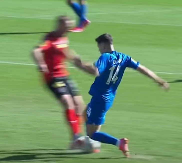 Как мы видим на стоп-кадре, игроки одновременно бьют по мячу, нога Дениса вроде бы остается на месте, но испытывает огромную нагрузку. Как позже выяснилось, связка осталась, а это хорошие новости.