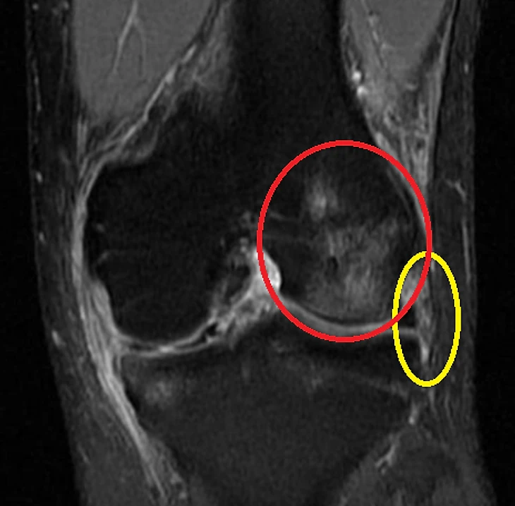 Там мы увидим примерно следующее: связка будет утолщена, но ее волокна остаются единым целым (желтый овал, сравните со здоровой связкой – на снимке слева). А в месте крепления связки может наблюдаться отек костной ткани (красный кружок, более светлый участок). В норме она однородного темного цвета. Это и есть контузия, которая возникла в момент удара – связка дернула тот участок кости, к которому крепится, спровоцировав такую реакцию. К счастью, связка осталась целой и не оторвалась от места крепления (тогда это был бы отрывной или авульсивный перелом).