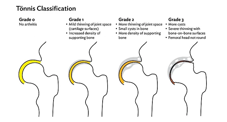 III стадия — крупные кисты в головке или суставной впадине, остеофиты, суставная щель отсутствует или значительно сужена, тяжелая деформация головки бедренной кости, признаки некроза.