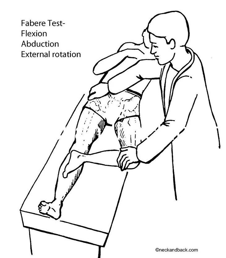 Затем появляется боль при движении уже в самом суставе — вращении бедра внутрь или его отведении. Может возникнуть чувство трения внутри сустава, будто бы что-то мешает его нормальному движению. Например, при движении, которое выполняется при тесте Патрика (или пробе Фабера). Если в таком положении появляется боль в паховой области или вокруг сустава, то тест положительный – есть какая-то патология тазобедренного сустава, провоцирующая боль.