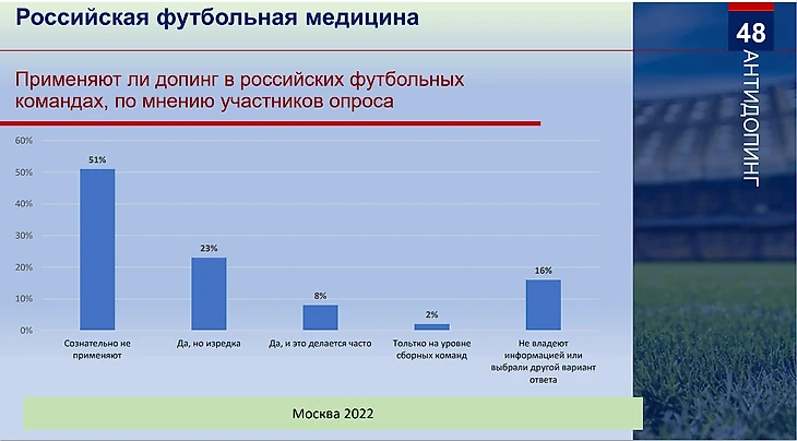 Больше половины опрошенных считают, что в русском футболе не используют допинг, причем делают это осознанно. Но процент ответивших «Да» требует пояснения: допинг — крайне широкое понятие, это большое количество веществ, методов и неправомерных действий (привет Кейта Бальде). Поэтому медики допускают, что в футболе может быть место мелким нарушениям.