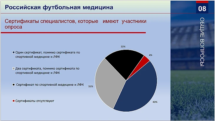 Подавляющее большинство опрошенных имеет сразу несколько сертификатов по разным специальностям. Это связано в основном с двумя факторами: во-первых, далеко не все врачи, особенно с большим стажем, сразу начинали работать в спортивной медицине и получали сертификат по спортивной медицине как дополнительную или новую специальность.
