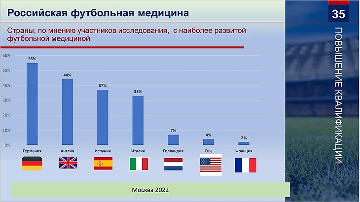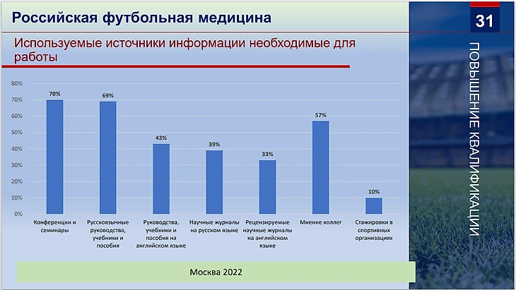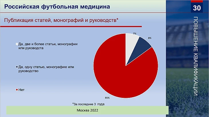 Но в составлении таких руководств и статей участвуют единицы — лишь 15% опрошенных имеют хотя бы одну публикацию за последние 3 года. Для сравнения: один только научный департамент ЦСКА, может опубликовать несколько статей в месяц в авторитетных, в том числе европейских, изданиях. Хотя в науке острой клубной конкуренции нет, и в соавторах одной статьи легко можно увидеть одновременно врачей ЦСКА, «Зенита» и «Спартака»