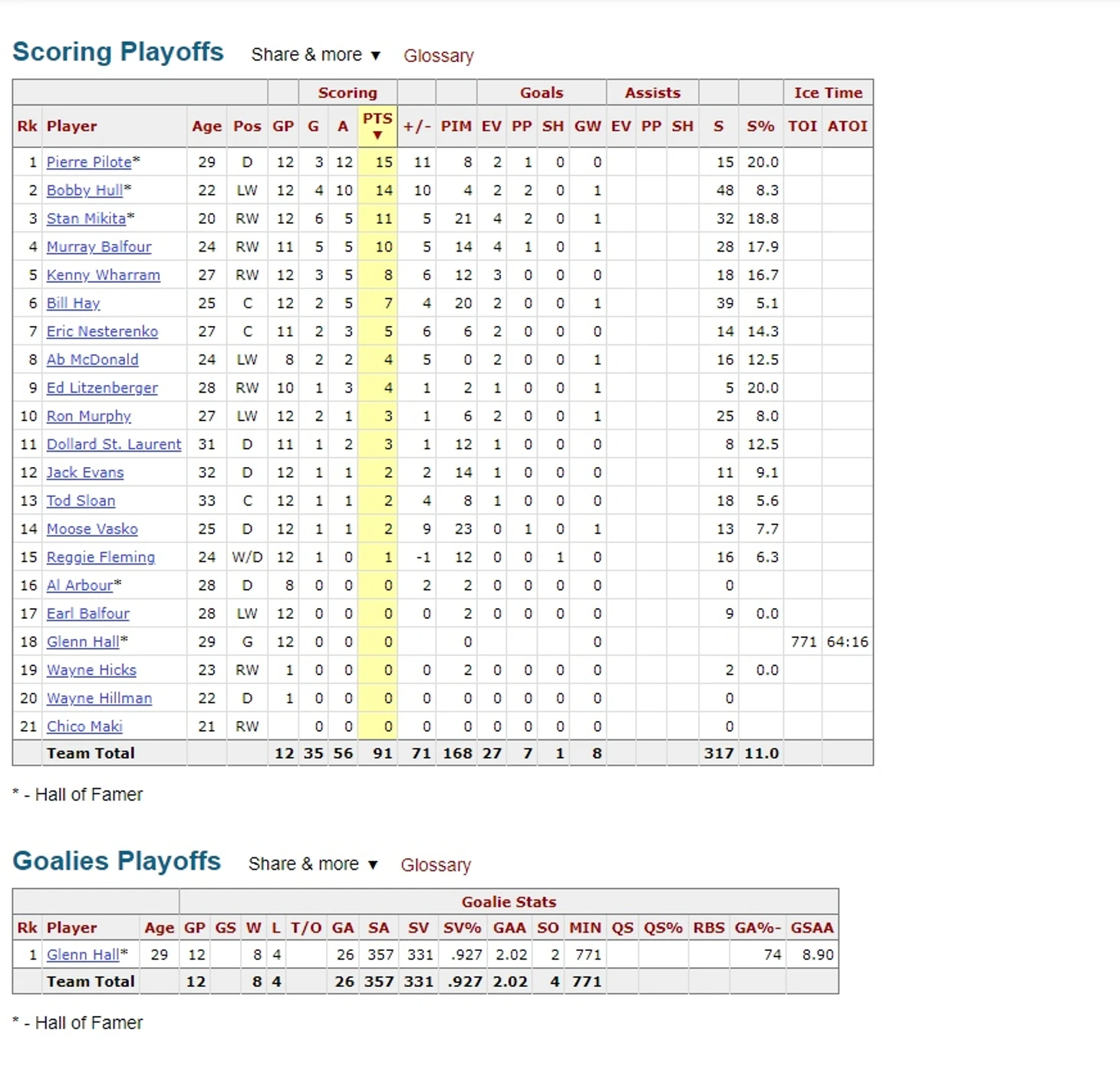 Индивидуальные трофеи. Мне бы хотелось сделать поправку на разные эпохи, предположив, что в 60-е годы была современная система личных призов. У Овечкина 16 индивидуальных трофеев. 7 Ришаров, у Халла было бы столько же. У Сани Колдер, 3 Харта и Арт Росс (призы, существовавшие во времена Халла). У Халла 3 Арт Росса и 2 Харта (Леди Бинг я не котирую). И здесь практически равенство. Санёк трижды выигрывал Тед Линдсей Эворд. Если бы в 60-е существовал этот трофей, смею предположить, что хоккеисты 2-3 раза признали бы Халла игроком года. И, наконец, в этом году в коллекции Овечкина появился долгожданный Конн Смайт Трофи. Халл выиграл КС в 1961 г., за 4 года до учреждения Конн Смайта. Лучшим бомбардиром Чикаго в том розыгрыше был дэф Пьер Пилот, лучшим снайпером распасовщик Микита, на воротах как штык стоял Холл, так что вряд ли виртуальный Конн Смайт за тот сезон можно вручить Бобби Халлу.