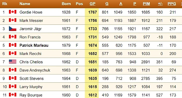 На сегодня только 11 человек сыграли свыше 1600 матчей в НХЛ.
