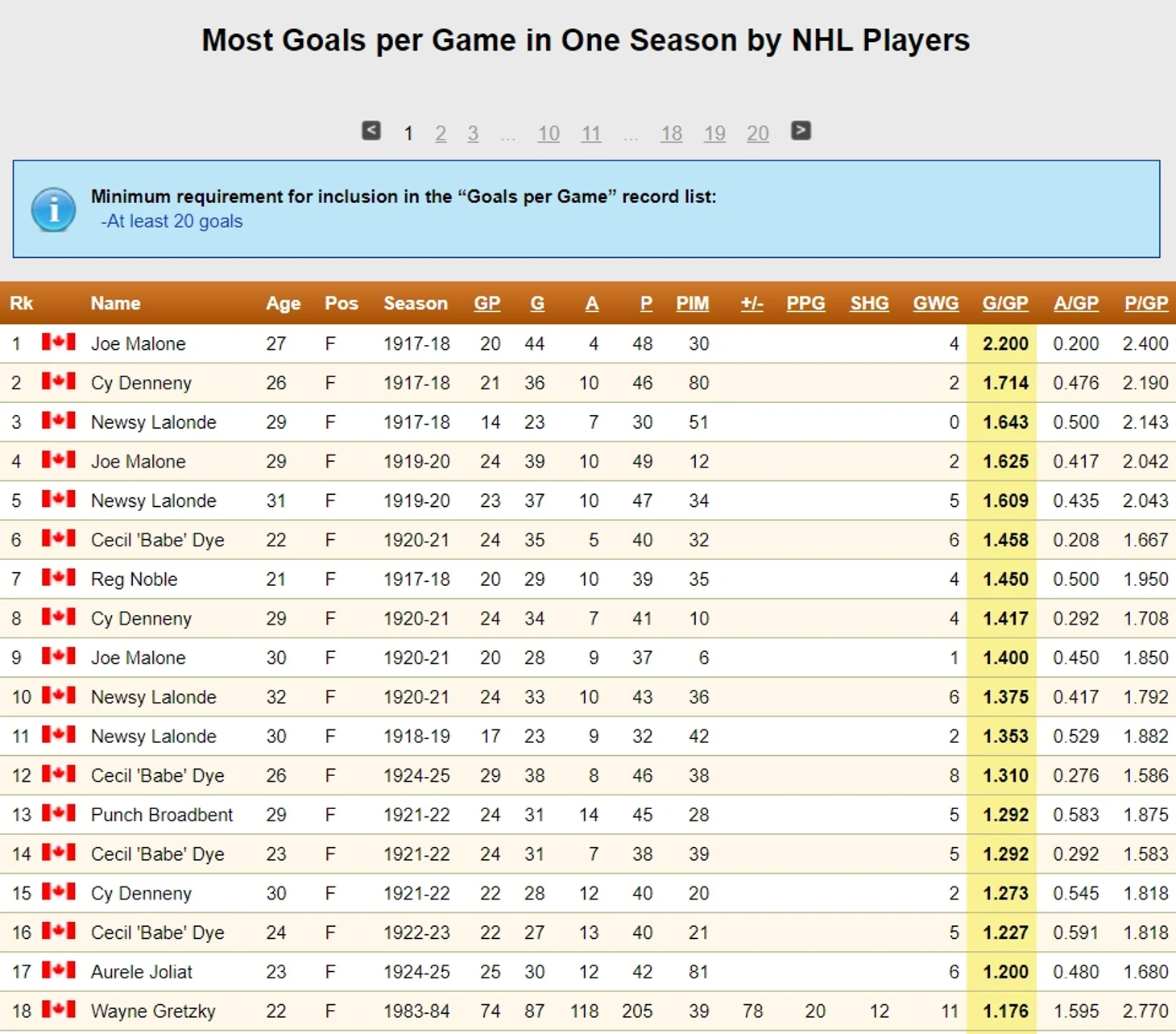 В сезоне 1983-84 Уэйн Гретцки забил 87 шайб в 74 играх. Количество голов за игру в среднем по сезону составило 1.18, лучший результат с 1925 г. При этом звёзды столетней давности Джо Мэлоун, Ньюси Лалонд, Сай Деннени, Бейб Дай имеют по 3-4 сезона с более высоким показателем GPG. Рекорд у Мэлоуна 2.2 (44 шайбы за 20 игр). Был такой хоккей, когда лучшие игроки команд спокойно забивали больше одной шайбы за игру.
